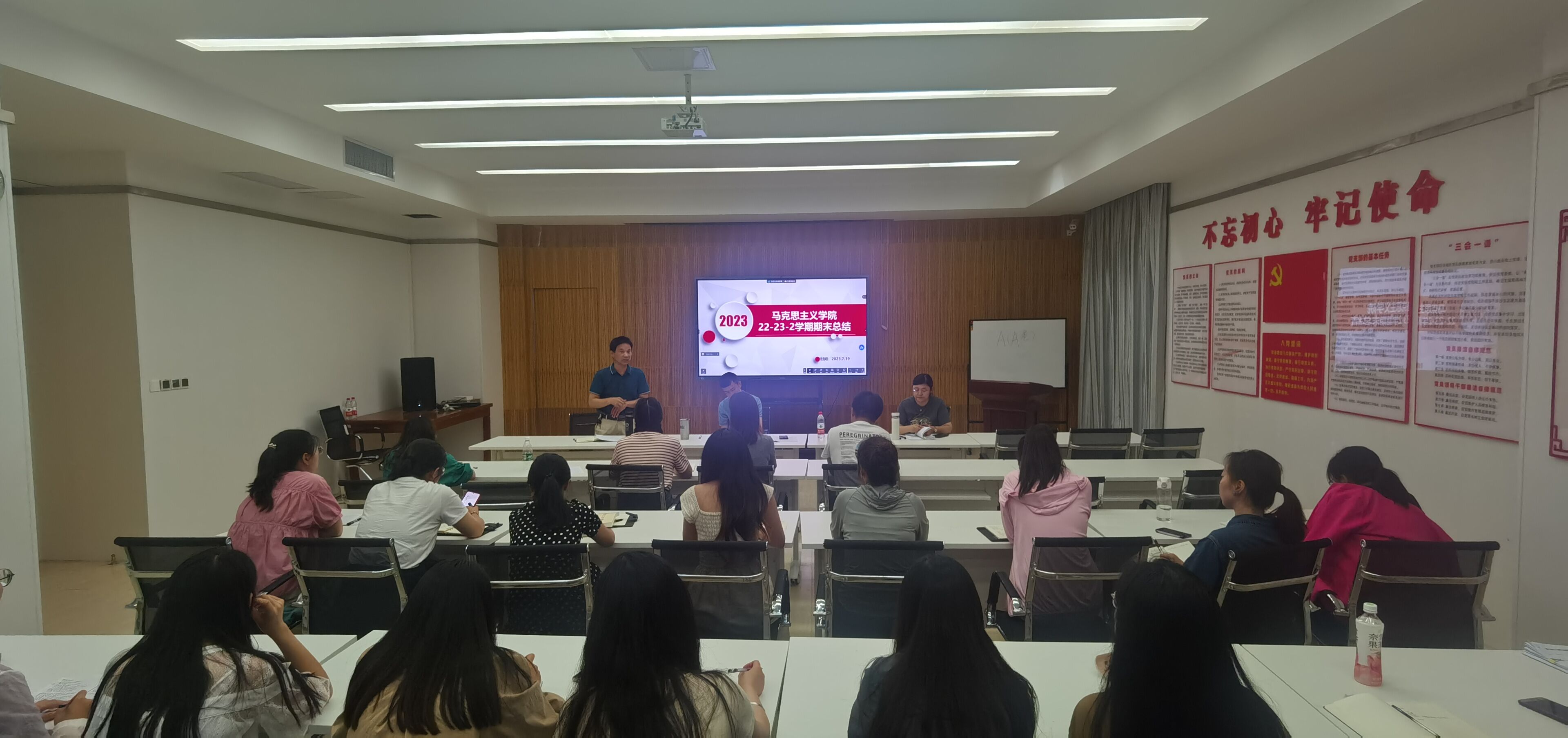 会上,郭永爱介绍了期末教学检查工作的基本情况,主要从以下四个方面展开:第一,教学工作概述。本学期各项教学工作运行情况良好,教学和科研方面取得了一些成效,教师积极参加各项活动,加强学院与其它各部门的交流与合作。对马院教师评教情况进行综合分析和说明,反思当前马院教师评教中存在的问题及其成因,深入探讨了提高教学质量的途径。第二,教学检查情况。学院结合自查、互查、抽查和专家专项检查情况,总结出本次期末教学检查工作中发现的问题,分析其原因,并且对这些问题给出相应的整改要求。第三,存在不足及措施。通过此次期末教学检查工作,发现马院教师对于教学材料规范、教学管理以及教学质量方面都有待进一步提高和改善。首先,认真落实集体备课,形式可多样化,并注重实效性。其次,各项工作要细致严谨,各教研室主任要严格把关。最后,加强队伍建设,提高教师的业务水平,提高课堂满意度。第四,近期工作计划。根据马院具体情况制定近期工作计划,具体包括以下几个部分:1.认真学习相关文件和制度;2.以课程为单位,做好课程考核和课程建设归档工作;3.重点人群磨课;4.集体备课,围绕板书设计、互动设计、基于学习动词教学流程设计等内容开展;5.完成2023年暑期教师研修暨师德集中学习教育。