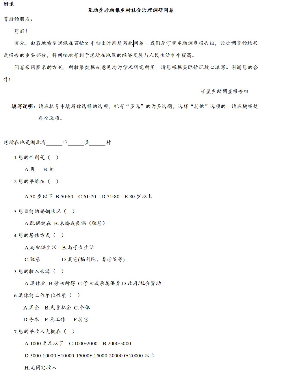 7月16日至19日,守望乡助团队成员深入匡河镇张家河村、匡河村、祠堂河村、汪家桥村、施家畈村等5个村庄,重点围绕老年人在生活照料、精神慰藉、健康关怀等方面的需求开展一对一问卷调研。在与老年人的对话中,团队了解到目前的家庭养老难以满足日益增长的现实养老需求,而互助养老发展滞缓难以从供给侧提高养老服务的数量和质量。在问卷调研中,团队成员从社区走向农村、从养老福利院走向五保户集中安置点,通过多层次全方位调研来摸清当下湖北省的养老基本情况与互助养老的发展现状。与此同时,团队也针对即将退休进入养老阶段的中年人群体,调研其养老规划和参与互助养老的意愿和要求。随后,实践团成员武聪颖、吴振涛和部分具有代表性的农村老年人互留联系方式,为后续建立长期交流,并进一步做到动态跟踪农村互助养老的发展做好准备。
