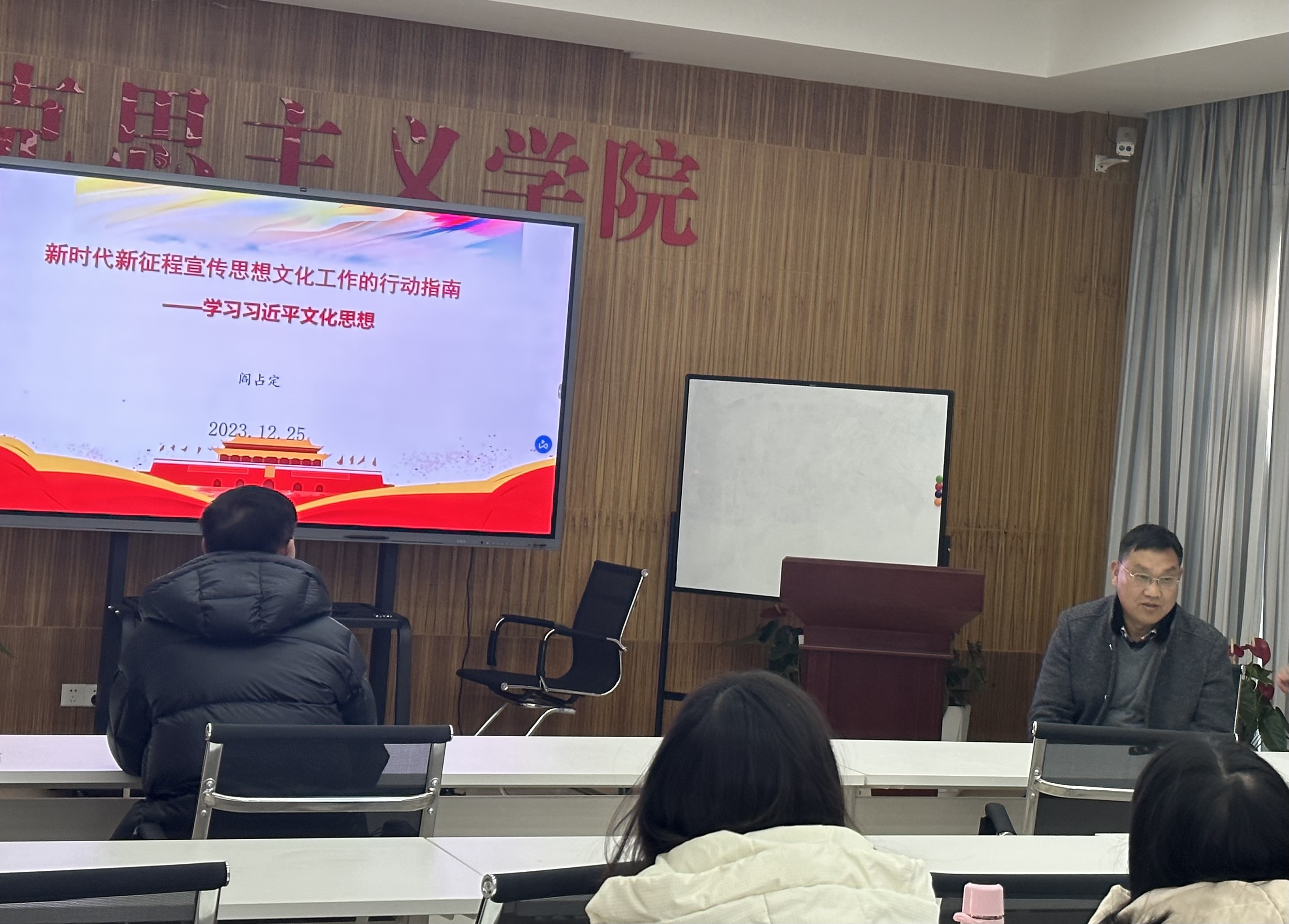 会上,阎占定教授从以下三个方面进行分享交流:第一,讲述了习近平文化思想的形成发展过程。简单介绍了习近平文化思想的背景、形成过程和理论创新,明确深入领会新时代党的宣传思想文化事业取得的历史性成就,深刻把握习近平总书记在新时代文化建设方面的新思想新观点新论断。第二,介绍了习近平文化思想的丰富内容。阐述了文化建设的重要性,要不断提高国家文化软实力和中华文化影响力;强调坚持和加强党对宣传思想文化工作的领导、坚持马克思主义在意识形态领域指导地位根本制度,明确意识形态工作是党的一项极端重要的工作。第三,阐述了习近平文化思想的重大意义。强调习近平文化思想是实践总结、理论结晶,彰显了明体达用、体用贯通的价值导向功能,更是实现中华民族伟大复兴的重要思想武器、行动指南。