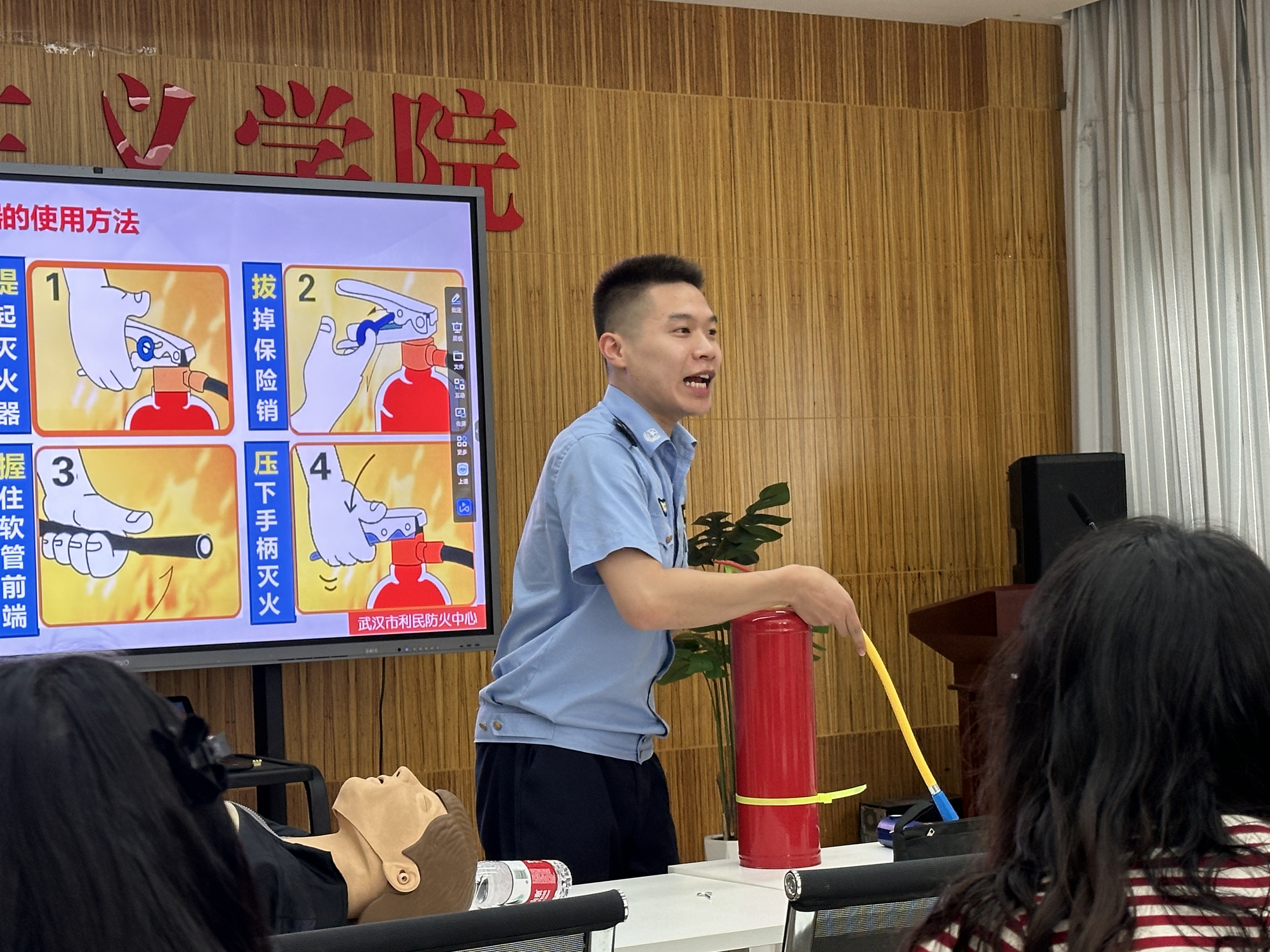 本网讯(通讯员 袁向旸)为进一步提升教职工消防安全意识和应急处置能力,筑牢校园安全防线,6月18日下午,yl9193永利集团以“人人参与消防 共创平安和谐”为主题,开展了一场生动实用的消防培训会。此次培训特邀武汉市利民消防宣传中心华智为教官主讲,学院党总支书记柯峰主持,学院全体教师积极参与,共同学习消防安全知识与急救技能。