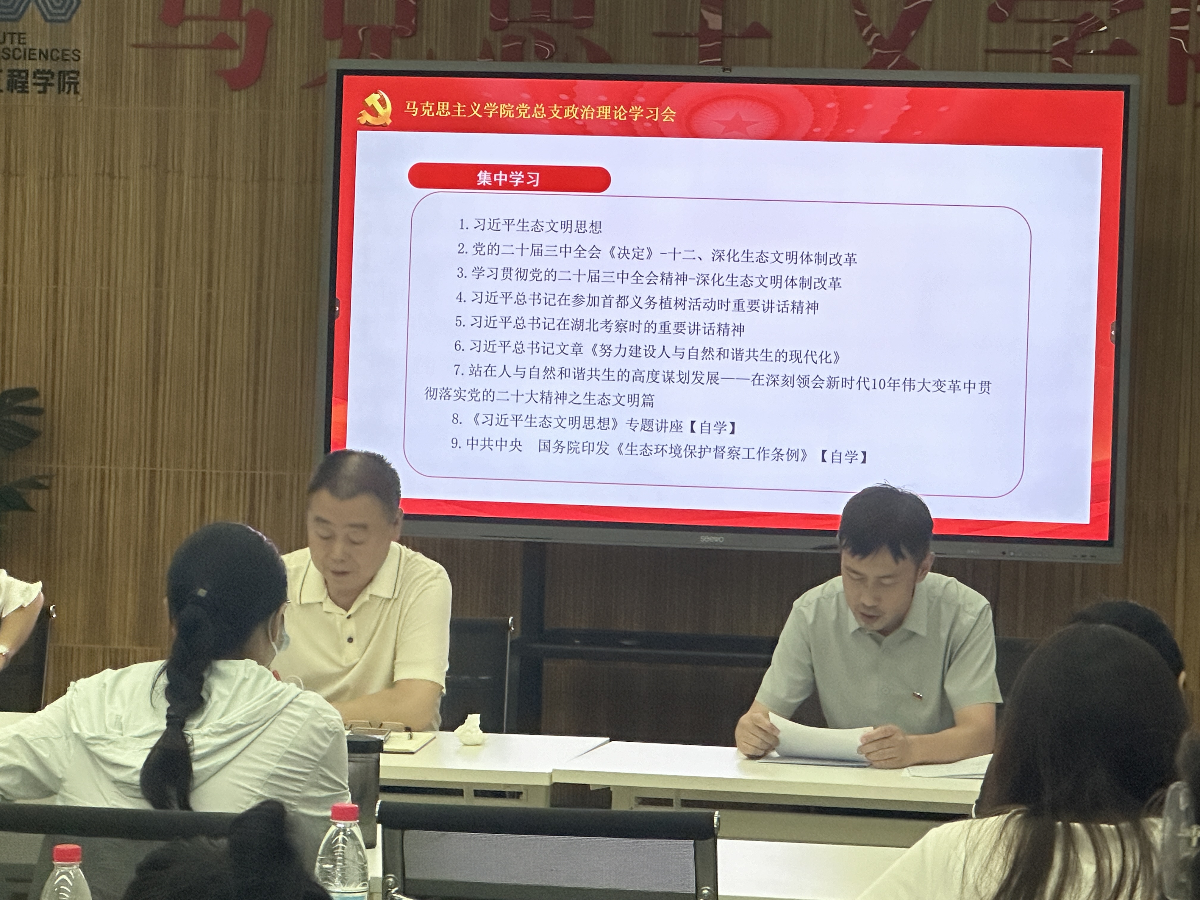 本网讯(通讯员 袁向旸)为深入学习贯彻习近平生态文明思想,推动党的二十大精神和二十届二中、三中全会精神落地生根,yl9193永利集团党总支于6月30日召开政治理论学习会。学校党委副书记、校长龚少平出席会议,学院党总支书记柯峰主持会议,全体党员参加学习。