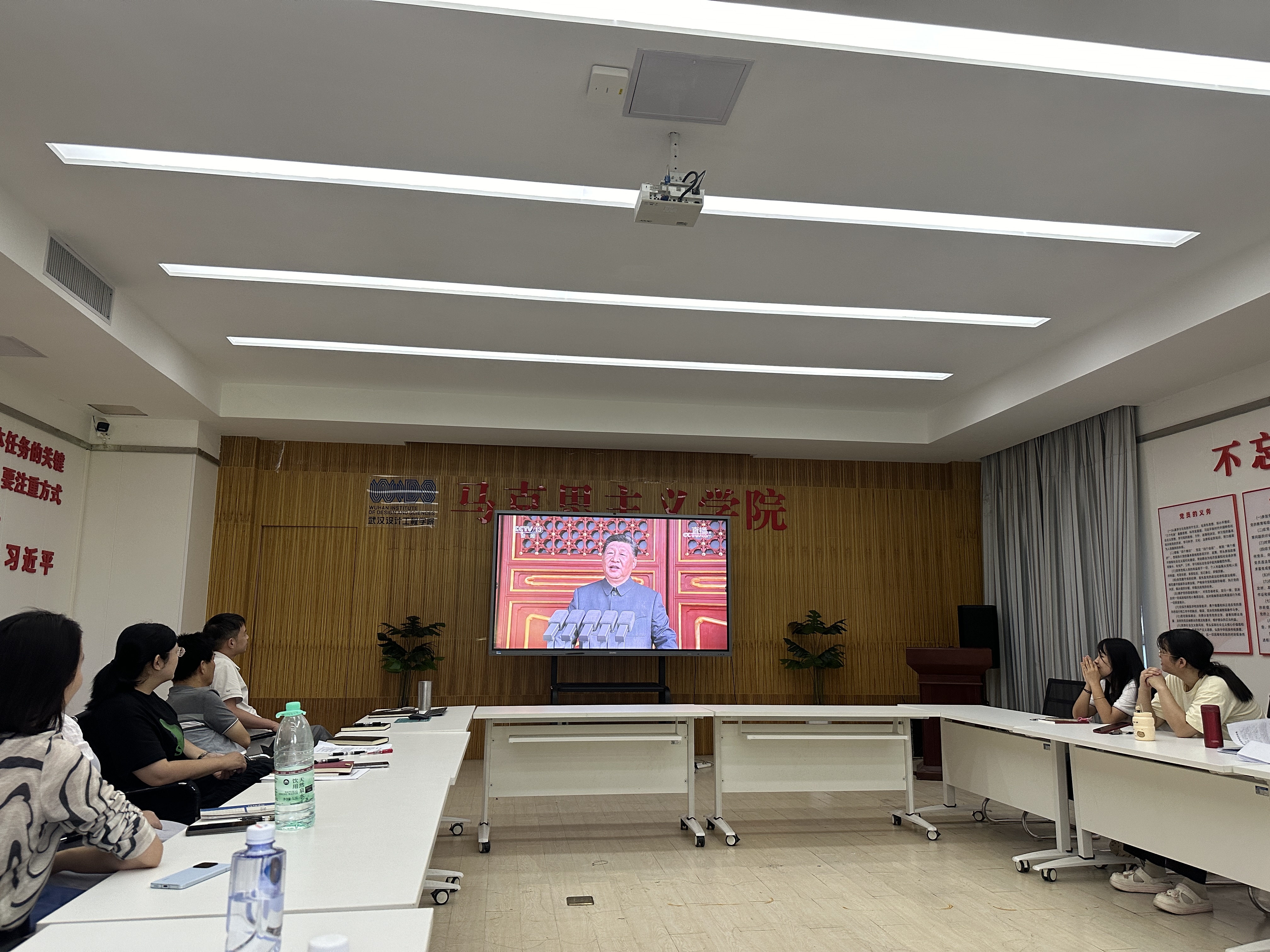 观看阅兵仪式直播结束后,学院党总支书记柯峰书记作总结发言。他指出,此次阅兵不仅是国家综合实力的展示,更是对伟大抗战精神的生动诠释。他强调,作为思政课教师,要深入挖掘抗战历史中的育人资源,将阅兵精神融入课堂教学,引导学生厚植家国情怀,传承红色基因。同时,他号召全院教师以抗战精神为指引,立足岗位、锐意进取,为培养担当民族复兴大任的时代新人贡献力量。