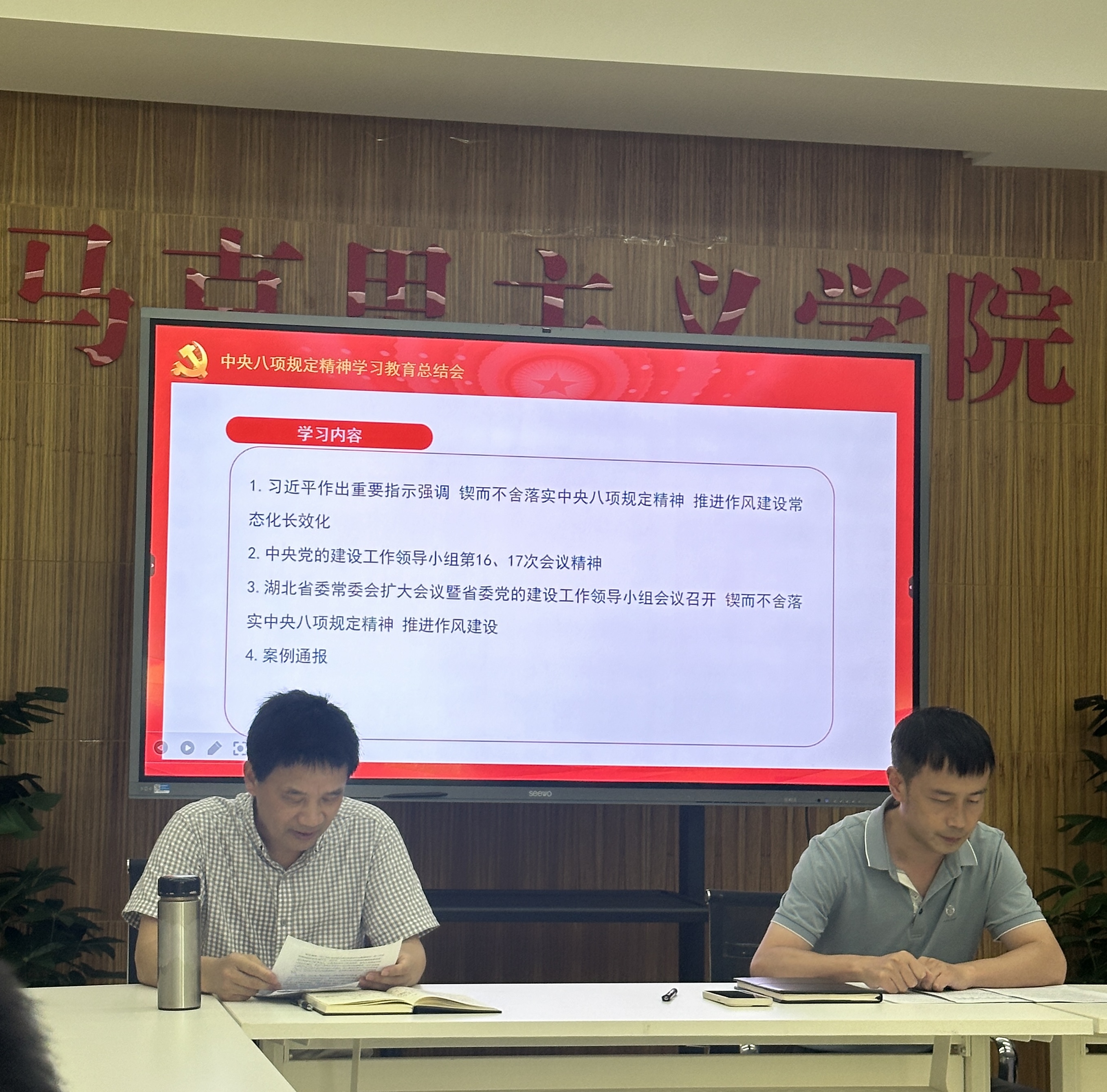 随后,副院长郭永爱领学了《湖北省常委会扩大会议暨省委党的建设工作领导小组会议召开 锲而不舍落实中央八项规定精神 推进作风建设》。郭院长详细传达了湖北省会议精神,要求全体教师以更高的政治站位、更严的标准要求,持续深化作风建设,确保中央八项规定精神在学院各项工作中落地生根。