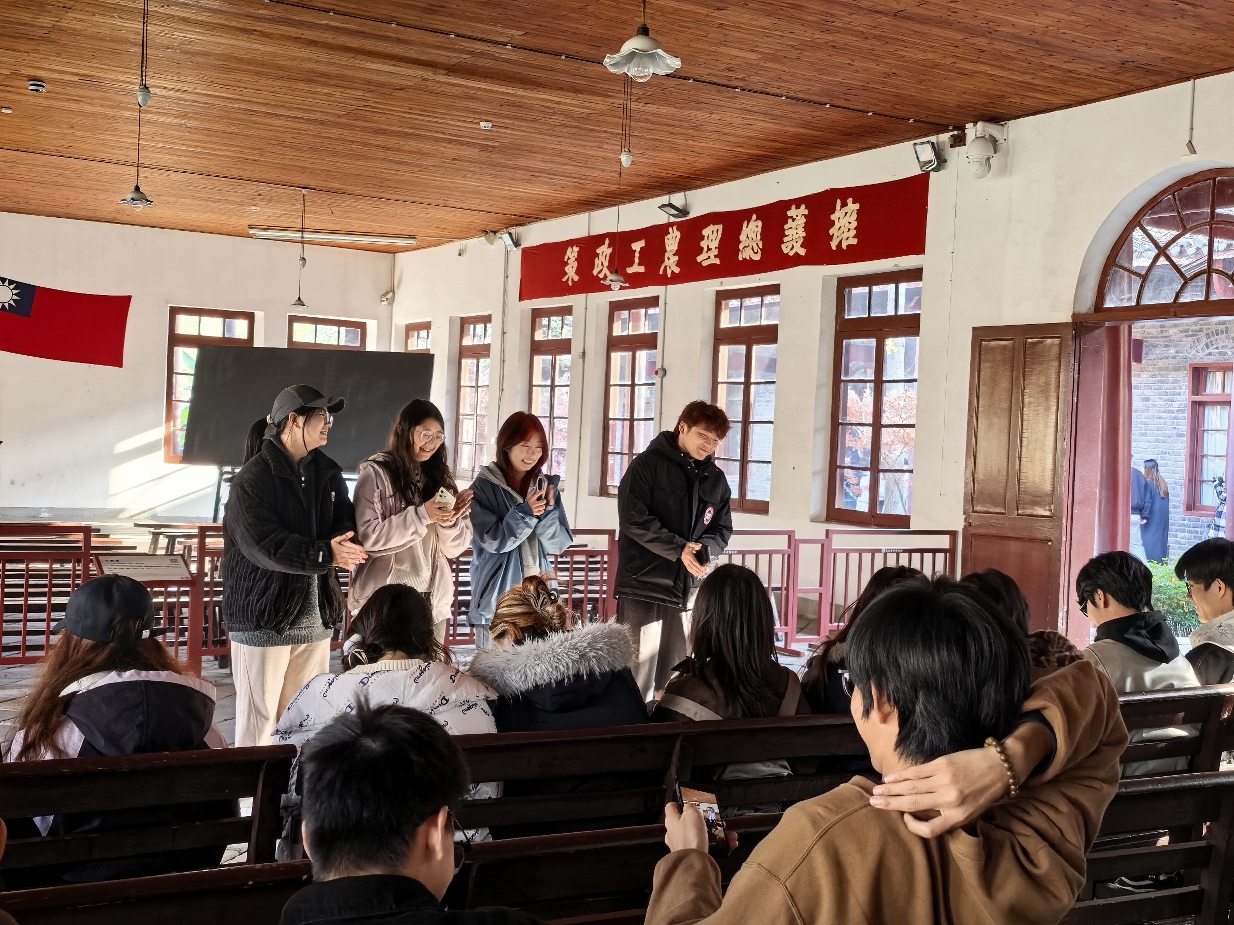 活动首站,师生们来到武昌中央农民运动讲习所旧址。带队教师结合1927年大革命风云,详细讲解农讲所创办的历史背景与战略意义。学生们依次参观了常委办公室、大教室和大操场,透过简朴的桌椅、斑驳的黑板,仿佛看到当年革命青年刻苦训练、热血澎湃的场景。教师现场抛出问题:“为什么说农民问题是中国革命的基本问题?”引导学生从农讲所培养出的800余名农运骨干身上,深刻理解中国共产党扎根人民、依靠群众的理论自觉。