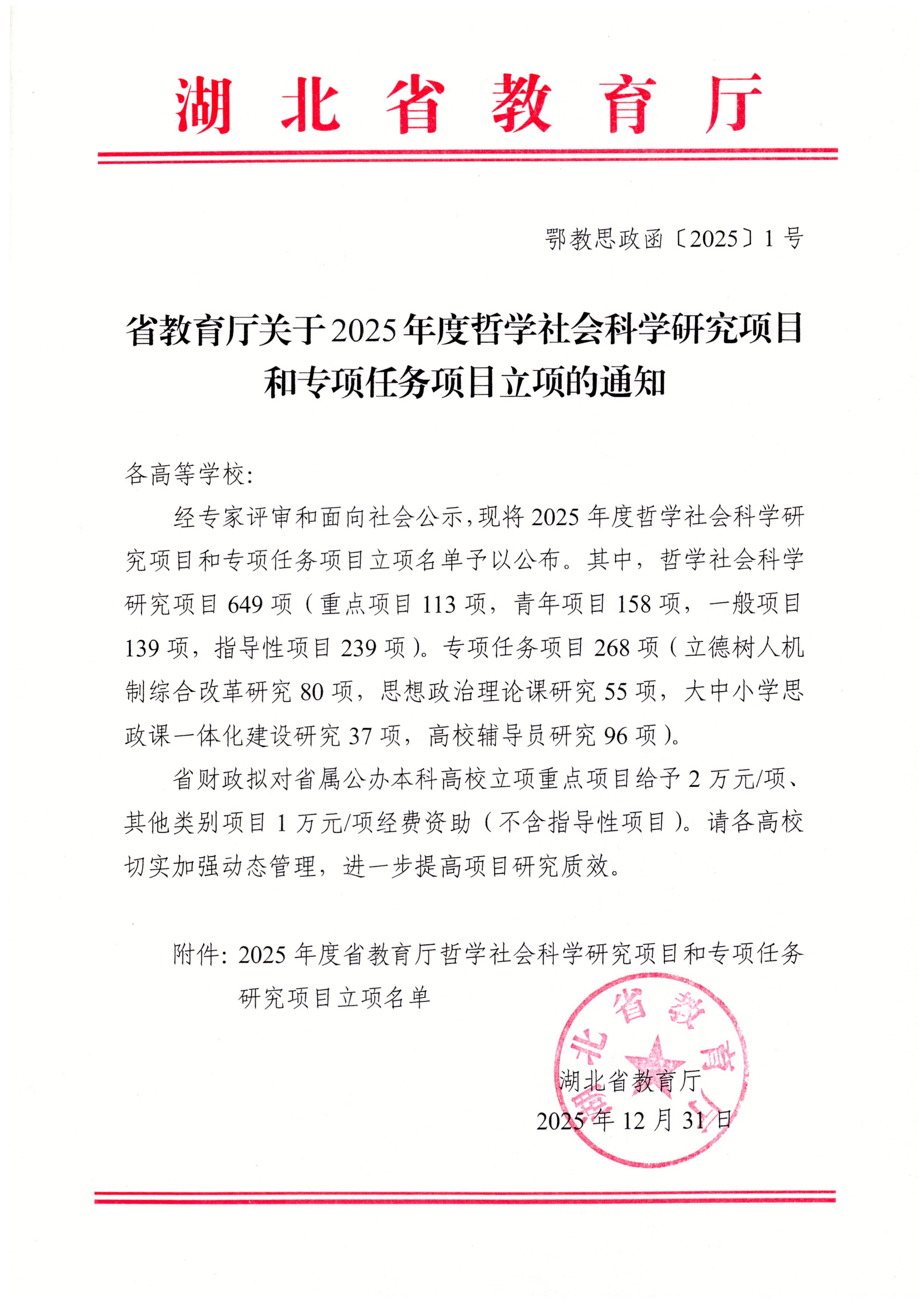本网讯(通讯员 袁向旸)近日,湖北省教育厅公布了2025年度哲学社会科学研究项目及专项任务项目立项名单。我校共有7项课题获准立项,其中,我院廖慧琼老师申报的《高校网络思政“破圈”路径研究—基于互动仪式链理论》成功获批“思想政治理论课研究”专项。